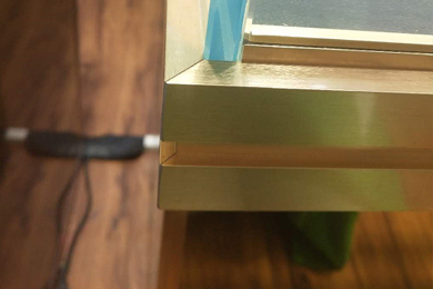 制作工藝:采用9厘UV板為基材,面貼5厘鏡面玻璃,開模制作鋁合金型材對角拼接,10厘超清超白鋼化玻璃臺面,鋁合金型材抗氧化處理,拉絲效果、電泳防指紋技術